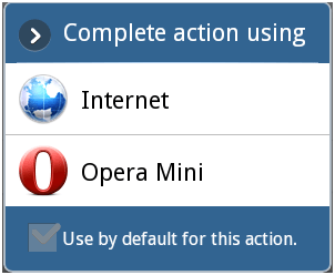 Saya biasanya milih Opera Mini. Dan mengeklik centang Use by default for this action. Dengan mencentang, maka kita menjadikan Opera Mini sebagai peramban utama (default browser).
