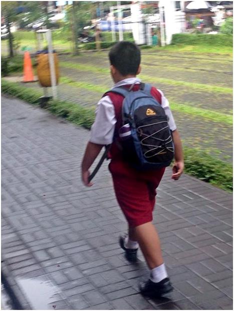 Rifki sempat memotret anak itu dari belakang dan mengunggahnya di linimasa Facebooknya serta menulis demikian: