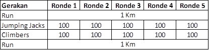 Jadi Iris itu terdiri dari menu lari sejauh 1 km lalu melakukan 5 ronde Jumping Jacks dan Climber, kemudian sebagai penutup, lari lagi sejauh 1 km. Jadi total saya melakukan Jumping Jacks sebanyak 500 repetisi dan Climbers 500 repetisi juga.