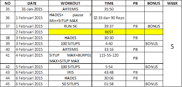 Artemis dan Hades plus Situp Max yang merupakan menu latihan minggu keempat akhirnya terbayar lunas. Tantangan membuat PB Hades (Without Star) dua kali pun bisa dilakukan, bahkan bisa sampai tiga kali. Sekarang PB Hades (Without Star) saya adalah 30:06. Mengapa Without Star? Karena pullup-nya masih pakai Negative Pullup.