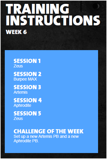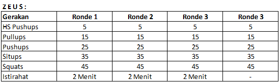Di minggu ini ada satu menu baru yaitu Zeus dan dua tantangan membuat Personal Best (PB) baru untuk Artemis dan Aphrodite. Zeus itu terdiri dari gerakan seperti ini: