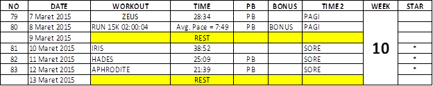 Dan di bawah adalah menu latihan minggu ini. Empat menu utama ditambah dengan menu bonus lelarian serta tantangan untuk bisa memecahkan Personel Best (PB) Zeus.