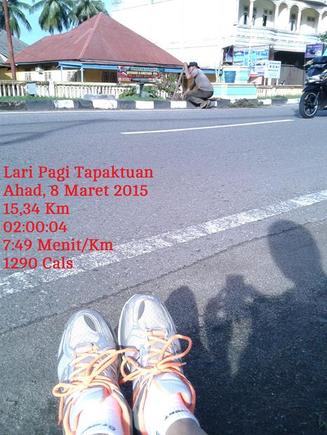Lari dan terus berlari. Hingga ke Simpang Kedeu Aru. Simpang dengan lampu merah yang baru dipasang Desember 2014 lalu. Lampu merah satu-satunya di Tapaktuan ini. Ini berarti saya sudah berlari 9,6 km. Lalu saya belok kiri menuju jalan Merdeka. Berlari di jalanan pertokoan yang masih sepi dan kebanyakan belum buka. Berlari di bawah tatapan mata para pengopi. Terus berlari menuju ujung pelabuhan dan ketika sampai di sana berarti saya sudah 10,6 km.