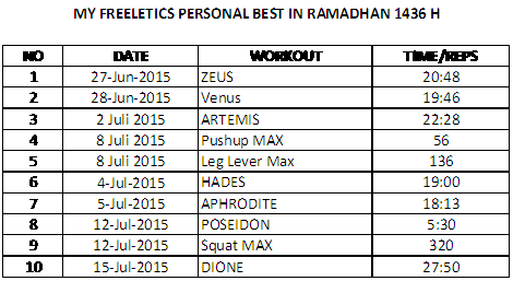 Beberapa jenis workout pecah PB berkali-kali dalam Ramadhan itu. Antara lain Zeus, Leg Lever Max, Squat Max. Bahkan Aphrodite yang di dalamnya terdapat gerakan yang paling banyak dibenci orang, burpee, mampu tembus dalam waktu 18 menit 13 detik. Alhamdulillah. Ini bukan ‘ujub. Tapi tak menyangka saja saya mampu melakukan semua itu. Mampu mendobrak mindset saya sendiri. Ternyata berpuasa tidak bisa menghalangi kita untuk berbuat yang terbaik dan semaksimal mungkin. Puasa bahkan saat terbaik buat kita berprestasi.