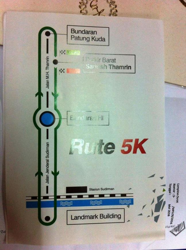 Rute lari mulai dari Sarinah, menuju kolong bawah Stasiun Sudirman menuju Wisma 46 Kota BNI dan putar arah menuju Hotel Indonesia, lalu putar lagi di Patung Kuda Patung Arjuna Wijaya dan finis di tempat yang sama kami mulai lari.