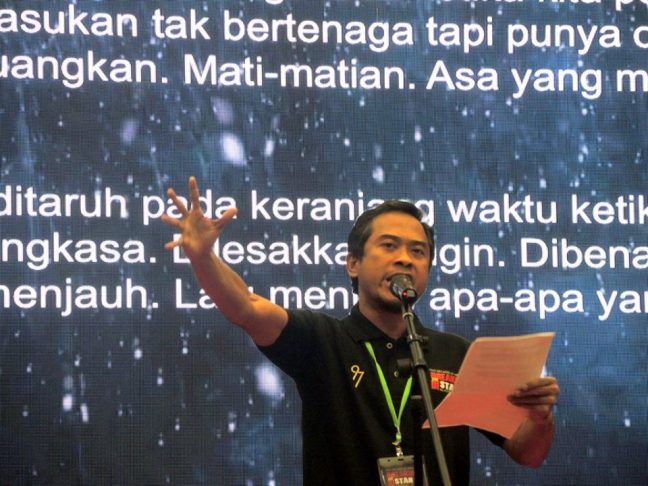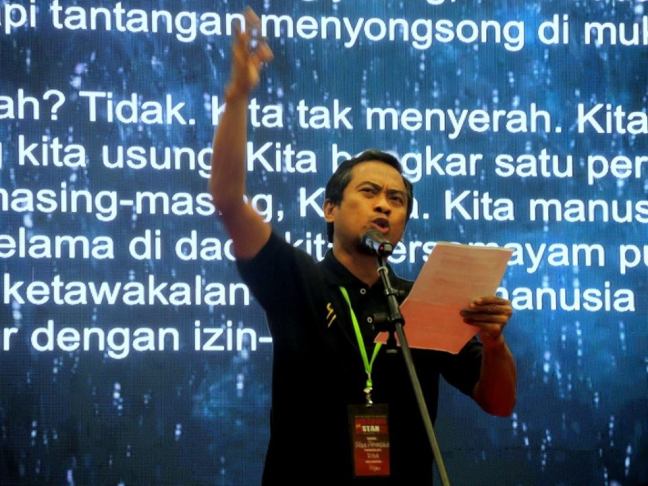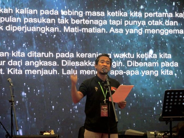 Tibalah saatnya. Saya maju ke depan. Sedikit memberikan pembukaan. Sambil mengucapkan terima kasih kepada panitia karena telah memberikan kesempatan kepada saya untuk berubah peran yang biasanya menjadi pendoa sekarang menjadi pembaca puisi.