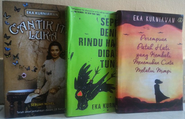 Setelah itu saya meminta saran dari teman yang sudah mengoleksi bukunya Eka, “Saya baca apalagi?” Ia menyarankan untuk membaca buku Seperti Dendam, Rindu Harus Dibayar Tuntas. Saya lalu berselancar untuk belanja online. Tiga bukunya Eka sudah sampai saja di rumah, tak lama. Buku yang berjudul Seperti Dendam, Rindu Harus dibayar Tuntas lalu buku Cantik itu Luka dan Perempuan Patah Hati yang Kembali Menemukan Cinta Melalui Mimpi. Tiga buku ini menjadi pembacaan saya di triwulan keempat 2017.