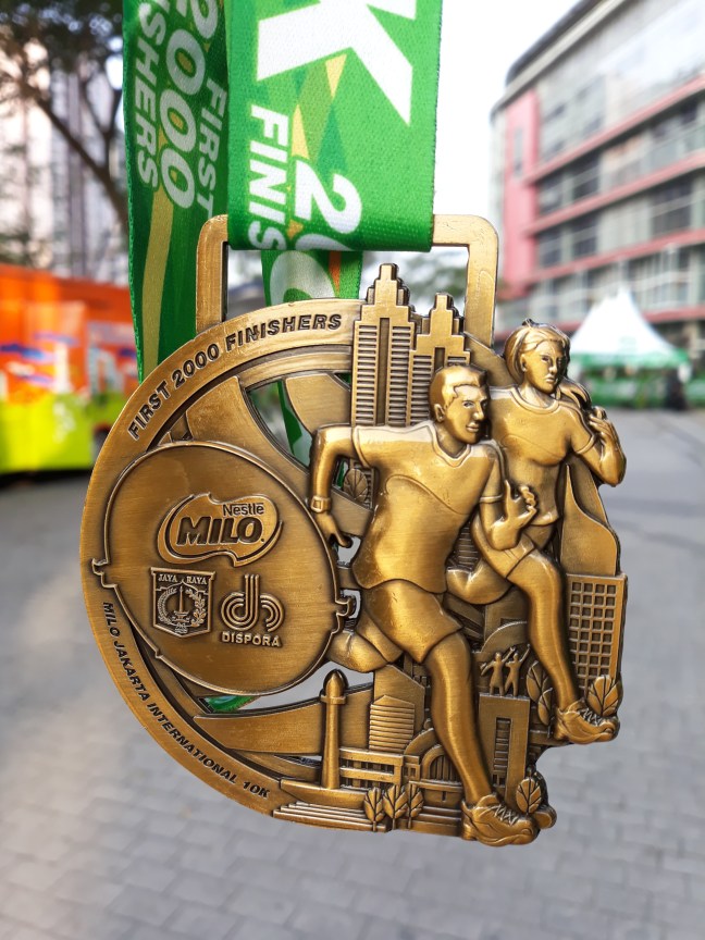 Menjelang 300 meter sudah banyak kerumunan orang menyemangati para pelari untuk segera finis. Saya berbelok ke kiri memasuki area Epicentrum. Jalan menuju garis finis penuh dan ramai dengan para pelari. Akhirnya saya finis dan masih kebagian medali khusus untuk 2000 penamat pertama.