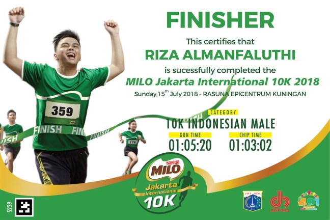 Catatan waktu yang ada di jam lari saya adalah 1 jam 3 menit 2 detik dengan peringkat 926 di kategori 10K Indonesian Male. Jauh dari Personal Best saya. Waktunya tiada berbeda dengan yang dicatat pada race result di situs web Milo.