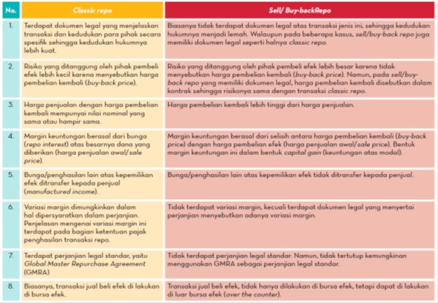 Utamanya adalah bahwa akad jual beli dalam Transaksi Repo Syariah ini berdasarkan akad jual beli sesungguhnya dengan menegasikan unsur riba berupa time value of money dalam perhitungan penjualan dan pembelian efeknya. Aspek perpajakannya tentu akan berbeda dengan Transaksi Repo konvensional.