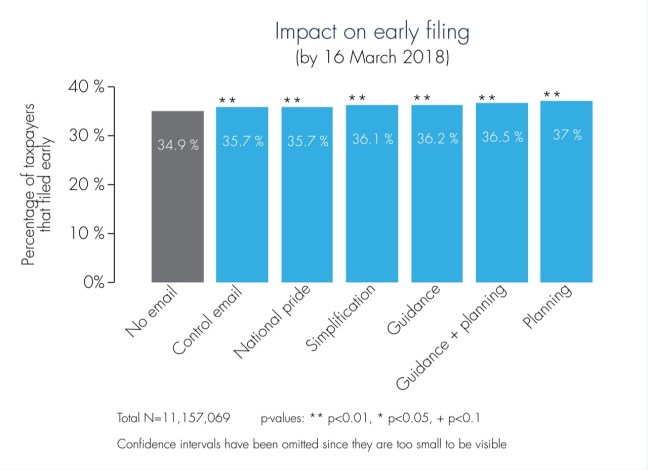 Hasil pengiriman surel pada 2018 menunjukkan surel berjenis Planning yang membantu perencanaan wajib pajak dalam menyampaikan SPT Tahunan memiliki jumlah statistik yang paling tinggi. Wajib pajak yang dikirim surel dengan jenis ini melaporkan SPT Tahunannya (sebelum tanggal 16 Maret 2019) lebih banyak daripada jenis surel lainnya dan lebih tinggi 2,1% daripada yang tidak dikirim surel sama sekali. Selisihnya ini setara 233.500 SPT Tahunan jika surel berjenis Planning dibagikan kepada 11,2 juta populasi.