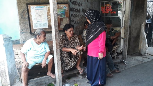 Rita akrab dengan warga sekitar dan menyempatkan diri mengobrol dengan mereka. Ia menyapa Wa Enong dan Bu Saneh yang sedang duduk-duduk di sudut gang. Tak ada pembicaraan lain kecuali Rita menanyakan tentang data kependudukan yang mesti diurus mereka berdua di kelurahan. Kami juga bertemu dengan salah satu pasien yang pernah Rita dampingi. Namanya Barji. “Masih diminum obatnya, kan?” tanya Rita dengan penuh perhatian kepada laki-laki bercelana pendek itu. Barji mengangguk.