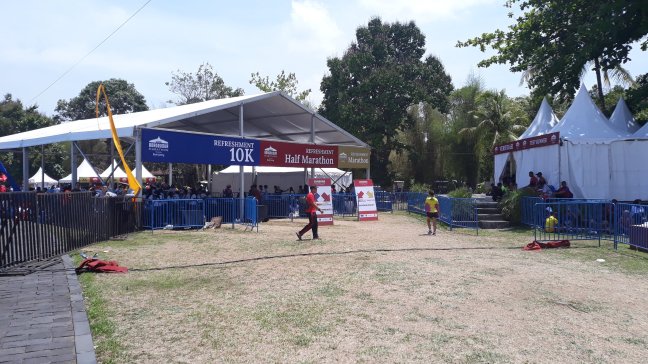 Untuk tahun ini saya tidak tertipu lagi dengan gerbang halu itu. Balon gerbang berwarna merah itu bukan garis finis sesungguhnya. Itu hanya gerbang salah satu sponsor lomba ini. Gerbang sesungguhnya masih jauh di belakangnya.