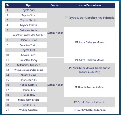Dari kriteria-kriteria tersebut ada 21 tipe kendaraan bermotor dengan semua variannya yang dapat memperoleh PPnBM DTP di tahun anggaran 2021.