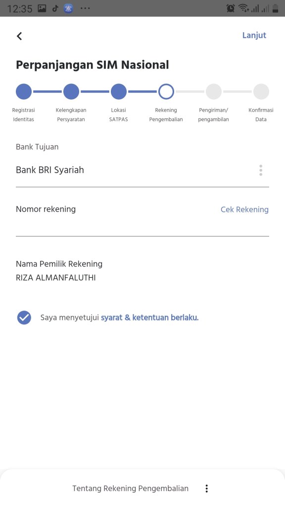 • Tahap berikutnya adalah mengisi Rekening Pengembalian. Pengisian ini diperlukan jika kita tidak lulus mendapatkan SIM satau perpanjangan SIM kita tidak disetujui. Uang yang telah kita setor akan dikembalikan.  Isi bank tujuan. Maksudnya bank yang kita miliki nomor rekeningnya. Kemudian isi nomor rekening kita. Lalu tekan tombol “Cek Rekening“.  Setelah itu akan muncul nama kita sebagai pemilik rekening. Kamudian isi lingkaran sebagai tanda menyetujui “Syarat &Ketentuan Berlaku.” Setelah itu “lanjut” ke tahap berikutnya.