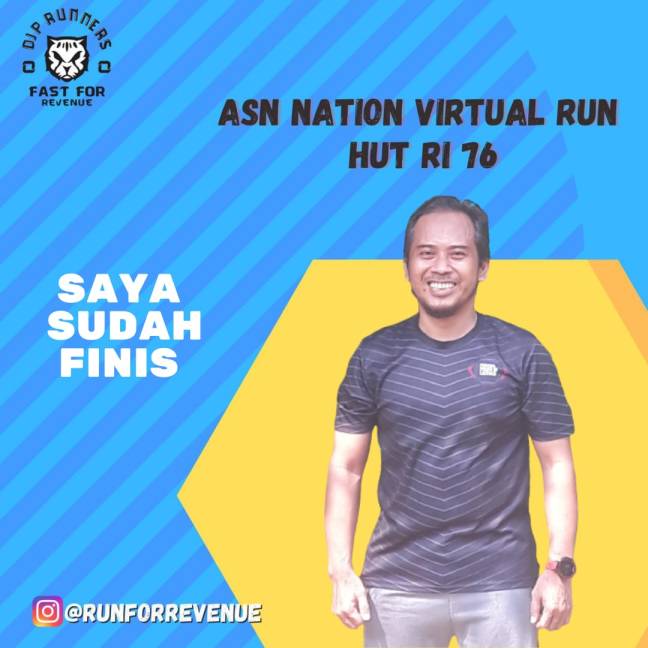 Kami berlima bergabung di grup DJP Kuat. Masing-masing harus menuntaskan jarak 76 km dalam lomba lari virtual yang diselenggarakan oleh ASNation dalam rangka memperingati HUT ke-76 Republik Indonesia. Ada 1005 peserta yang tergabung dalam 201 tim lari mengikuti kegiatan ini.