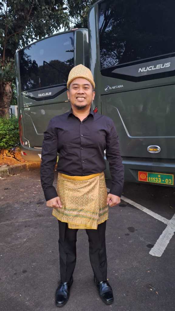 Hari ini, saya memilih kostum yang simpel saja: baju lengan panjang hitam, celana panjang hitam, kain sarung dan penutup kepala kuning khas melayu. Sudah itu saja. Sebelumnya saya sempat bingung mau memakai wastra seperti apa, tetapi istri mengingatkan kalau saya pernah memakai wastra dalam sebuah rapat koordinasi Kantor Wilayah DJP Jakarta Khusus. Ia langsung mencarinya dan ketemu.