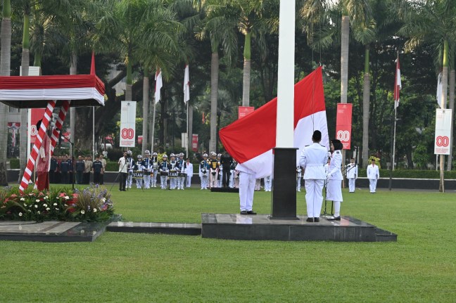 Saya pikir, upacara HUT RI ini akan memakan waktu lama dan ada pidato dari Bu Menteri. Ternyata tidak. Praktis sekali. Mulai dari pengibaran bendera merah putih, mengheningkan cipta, pembacaan teks proklamasi, penyerahan piagam penghargaan, hingga doa bersama.