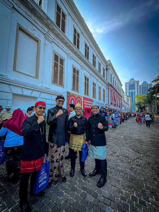 Sebelumnya saya pernah mengikuti upacara Hari Kemerdekaan RI di tempat yang sama. Sebagai peserta upacara biasa dengan memakai seragam Kementerian Keuangan. Hari ini saya memakai kostum yang berbeda daripada biasanya. Panitia meminta saya untuk memakai pakaian Wastra Nusantara. Wastra Nusantara ini baju adat dalam versi ringan. Kalau baju adat itu adalah pakaian lengkap tradisional sebuah daerah, sedangkan wastra merujuk pada kain tradisional nusantara. Wastra sendiri merupakan kata yang berasal dari bahasa Sanskerta, vastra, yang berarti kain, pakaian, lembaran tekstil.