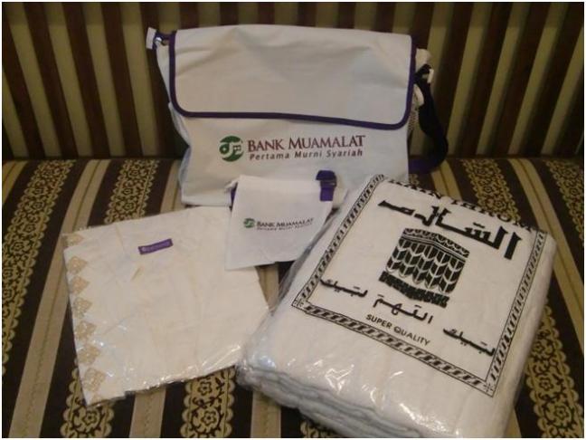 Sebelum pergi kami diberikan cinderamata. Satu tas untuk saya yang isinya satu set kain ihram, baju koko, dan kantung batu. Dan satu tas lain yang lebih kecil untuk istri saya berisi satu gamis, jilbab, mukena, dan kantung batu.