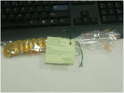Coklat yang dibungkus dengan kertas keemasan, disusun sedemikian rupa hingga membentuk deretan kepingan uang emas, dibungkus dengan plastik transparan yang diujungnya diikat dengan tali hias dan terdapat kertas yang bertuliskan bait-bait seperti di awal tulisan ini. So, sweet…
