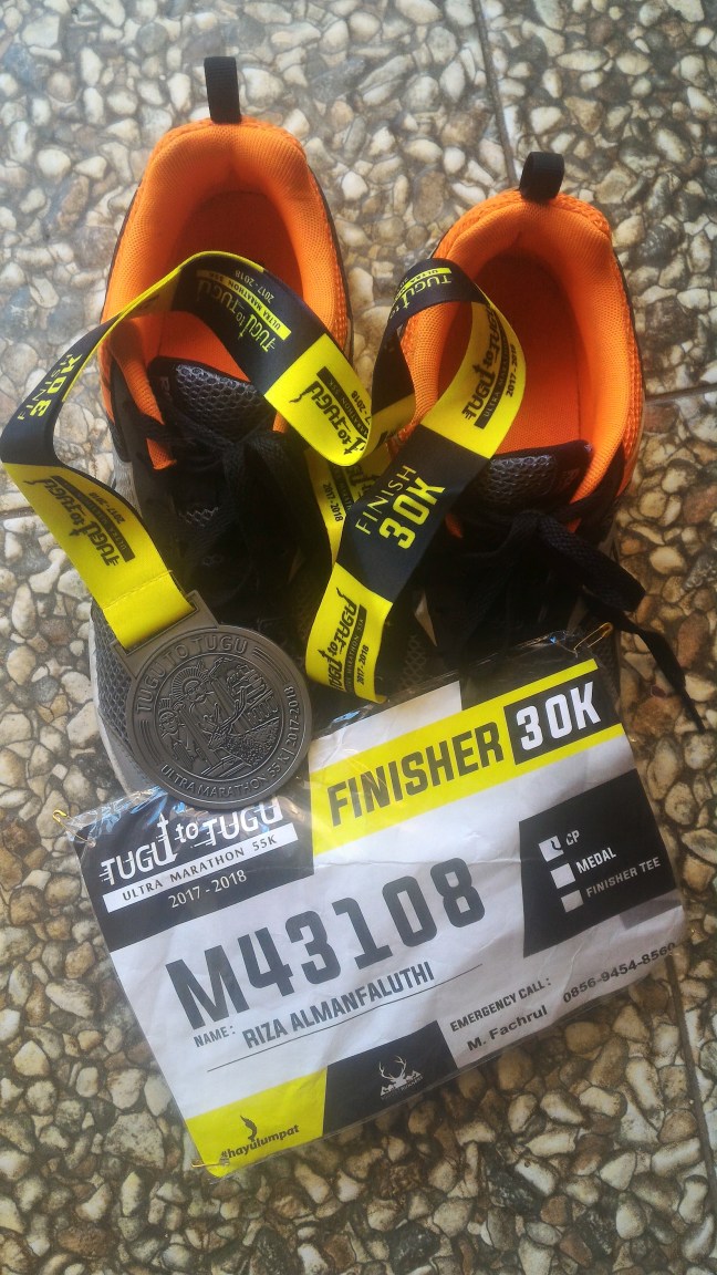 Setelah menerima medali dan kaos sebagai penamat, saya segera membereskan peralatan saya. Tiba-tiba kembali rasa mual itu muncul. Saya segera cari tempat sepi. Di bawah pohon palem yang baru tumbuh, saya memuntahkan semua isi perut. Semuanya cairan yang tadi saya minum di sepanjang pelarian itu. Lega.