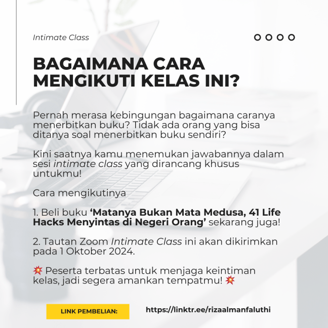 📚 Beli buku ‘Matanya Bukan Mata Medusa, 41 Life Hacks Menyintas di Negeri Orang’ atau buku ‘Sindrom Kursi Belakang’ dan dapatkan tiket GRATIS untuk bergabung di Intimate Class ini! 🎟️